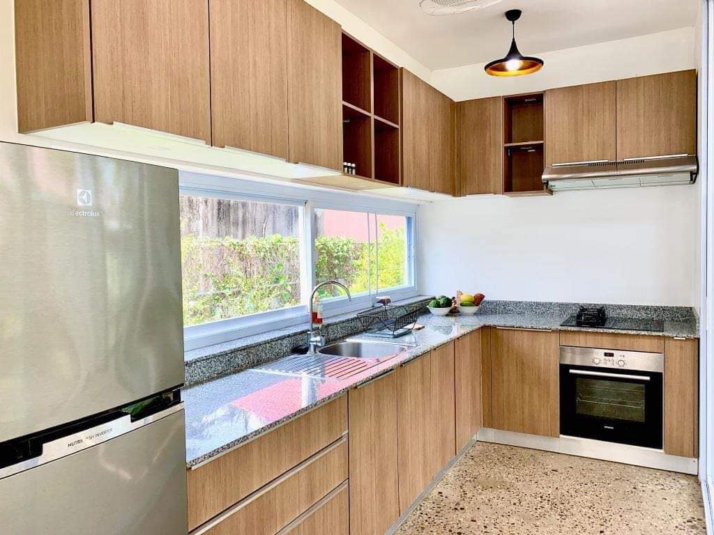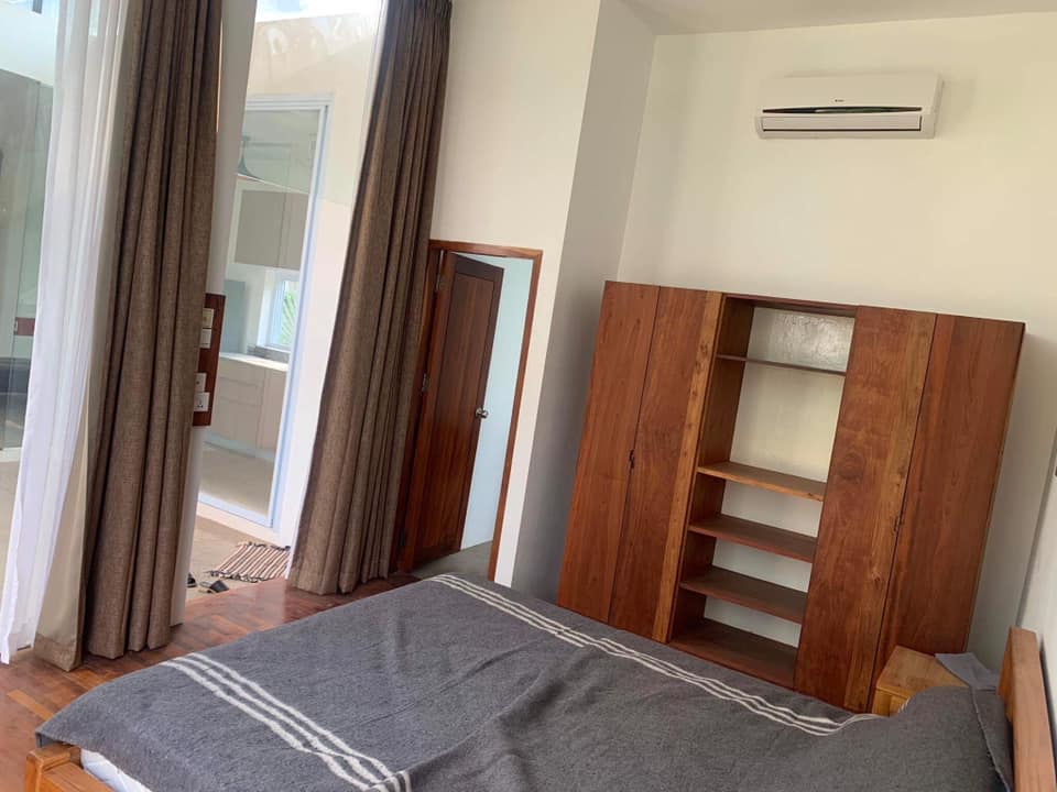 2 bedrooms, 1 bathroom, open living room connected with dining area and kitchen, basic furniture, hot water, shower, electricity appliance, AC, garden, car parking, fence, far from the main street.