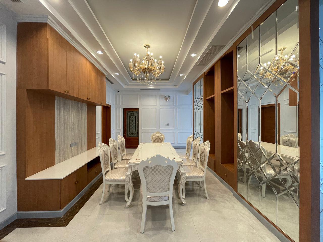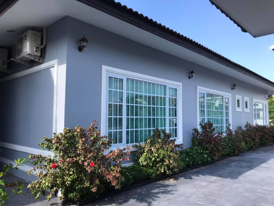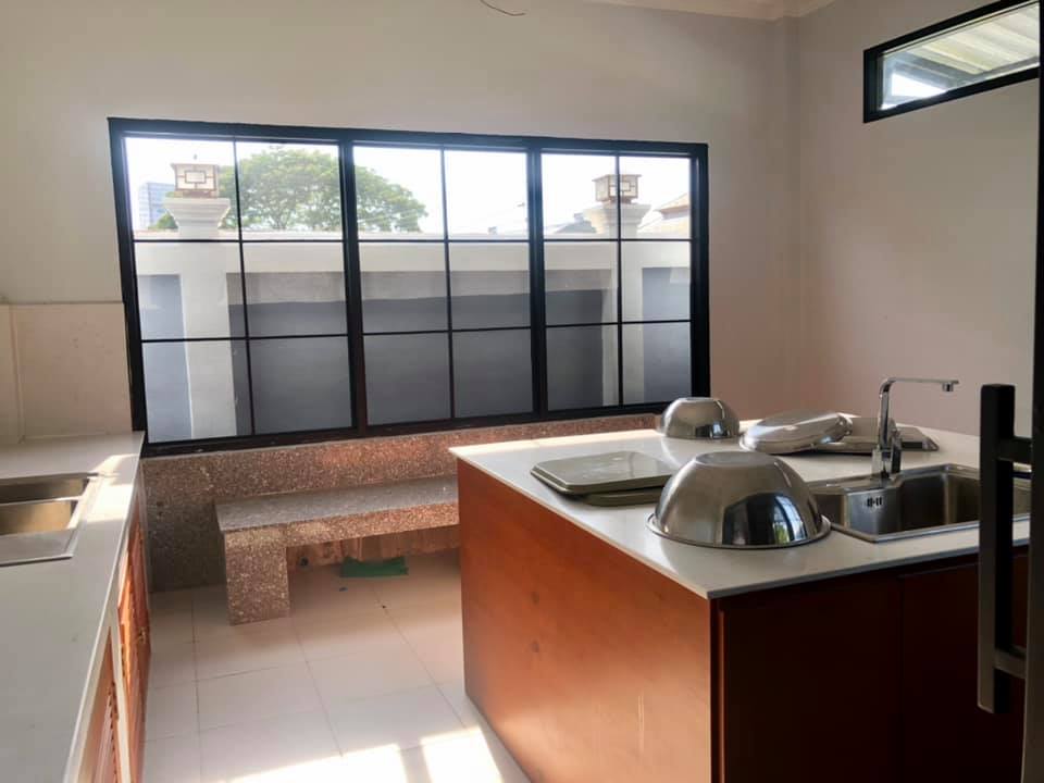 4 bedrooms, 5 bathrooms, 2 bedrooms outside, 3 toilets outside, full furnished, nice decoration, granite floor, western kitchen, lao kitchen, electronic oven, kitchen cabinet, washing room, storage room, Large garden, wall, remote gate, good access road