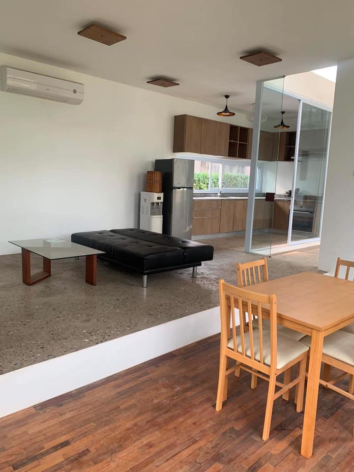 2 bedrooms, 1 bathroom, open living room connected with dining area and kitchen, basic furniture, hot water, shower, electricity appliance, AC, garden, car parking, fence, far from the main street.