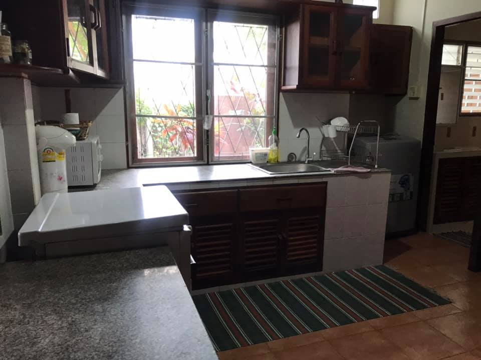 3 bedrooms, 4 bathrooms, 1 living room, 1 working area, terrace, dining area, 1 kitchen, with the furnitures, nice decoration, woodem floor, AC, hot water system, shower, wire bar windows, car parking spaces, nice garden and the shade, wall, gate.