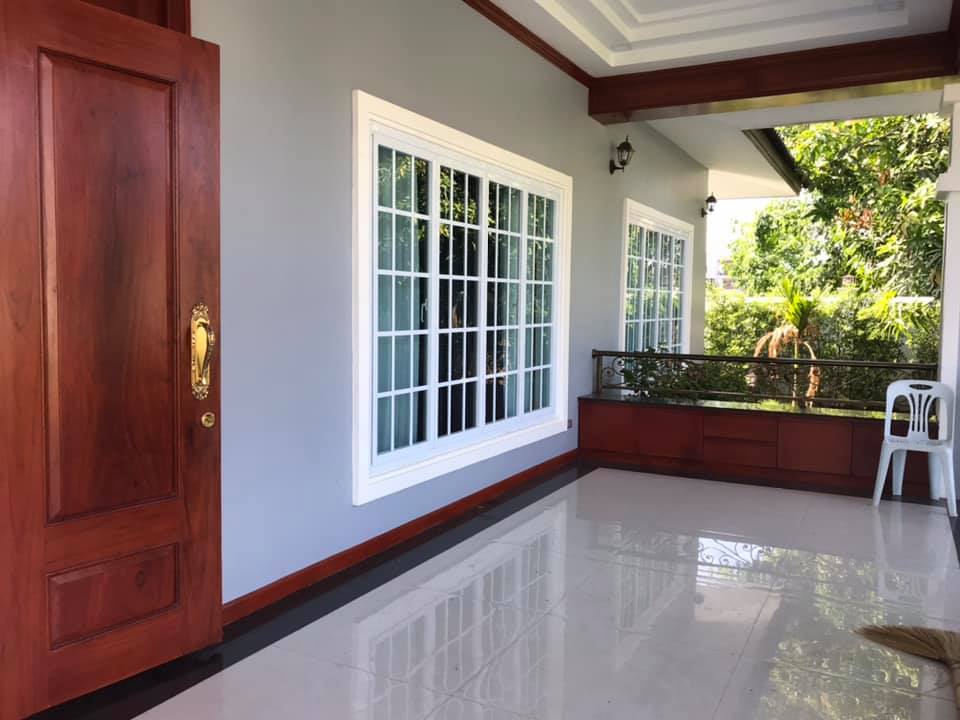 4 bedrooms, 5 bathrooms, 2 bedrooms outside, 3 toilets outside, full furnished, nice decoration, granite floor, western kitchen, lao kitchen, electronic oven, kitchen cabinet, washing room, storage room, Large garden, wall, remote gate, good access road