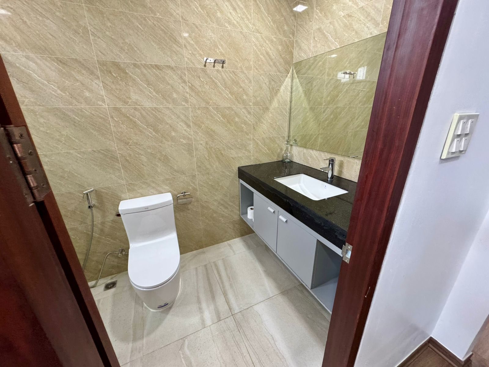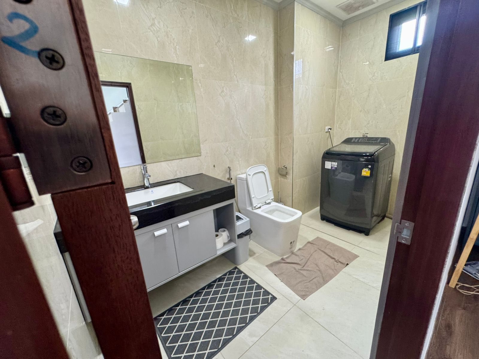 - 4 bedrooms, 3 bathrooms attached, 1 sharing toilet, 1 large living room, 1 dining room, reading area, 1 modern kitchen, electric appliances, hot water system, bathtub & shower, title floor, high ceiling.