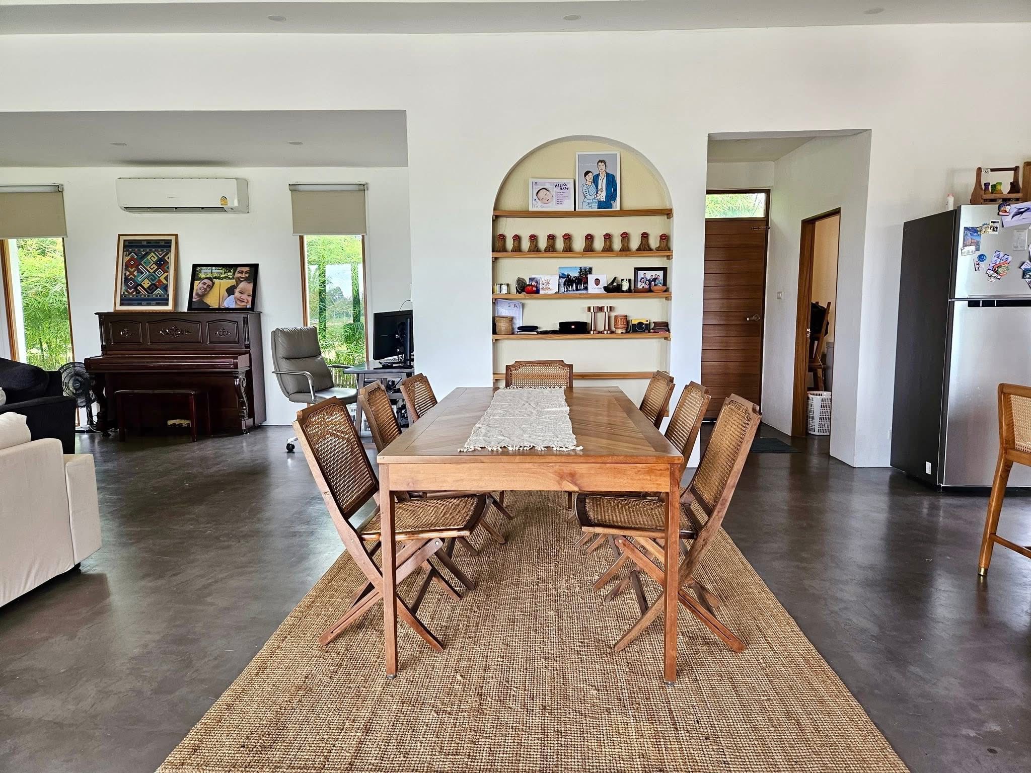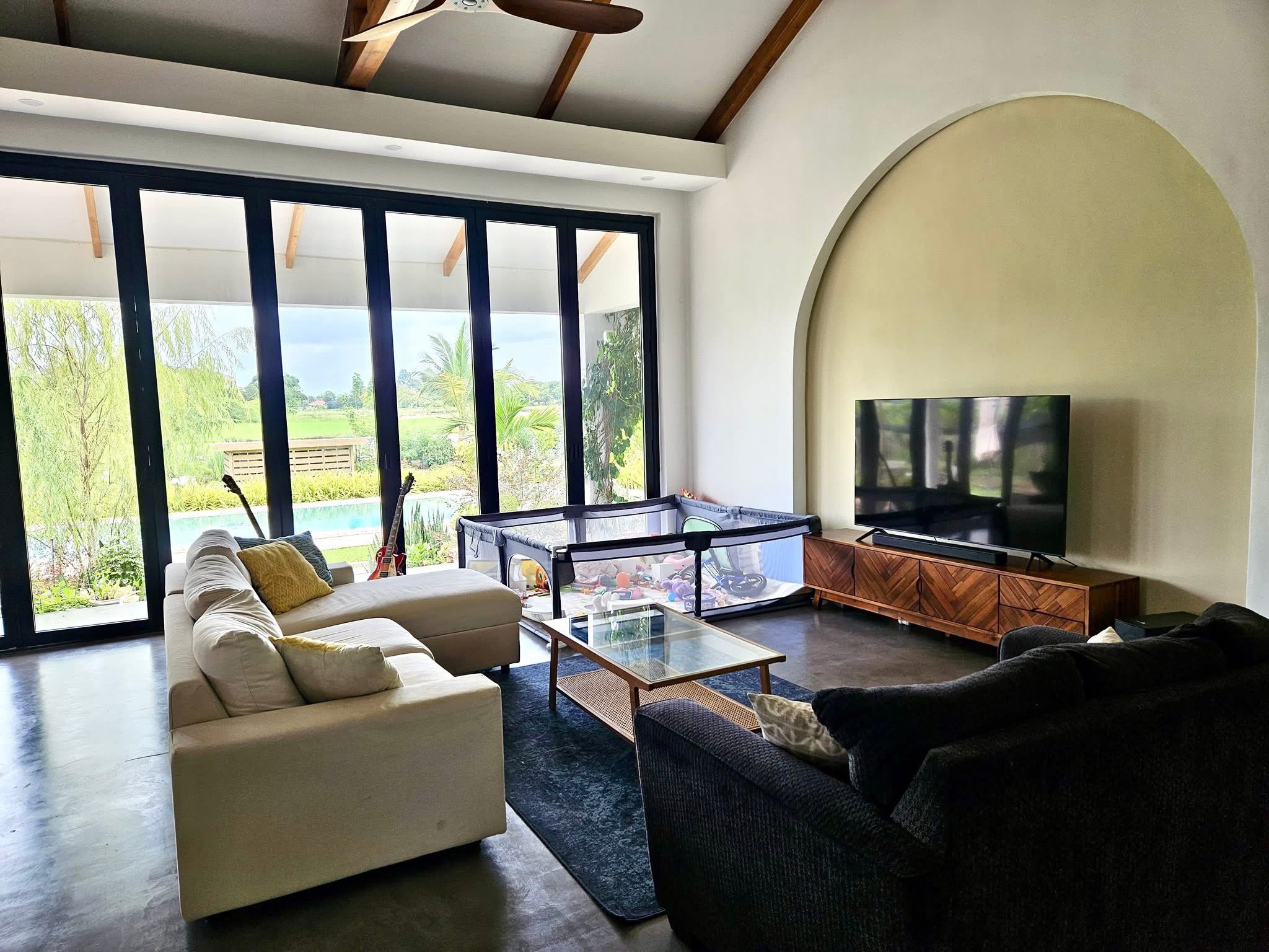 Modern 2-bedroom, 2-bathroom villa with private pool, Open living room, Dining area, Kitchen, Bright & white, spacious garden, and beautiful rice field views. Fully furnished, with electric gate, CCTV, laundry room, and secure parking.