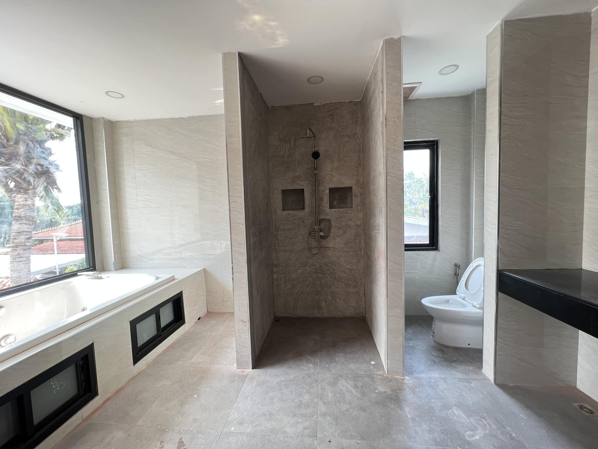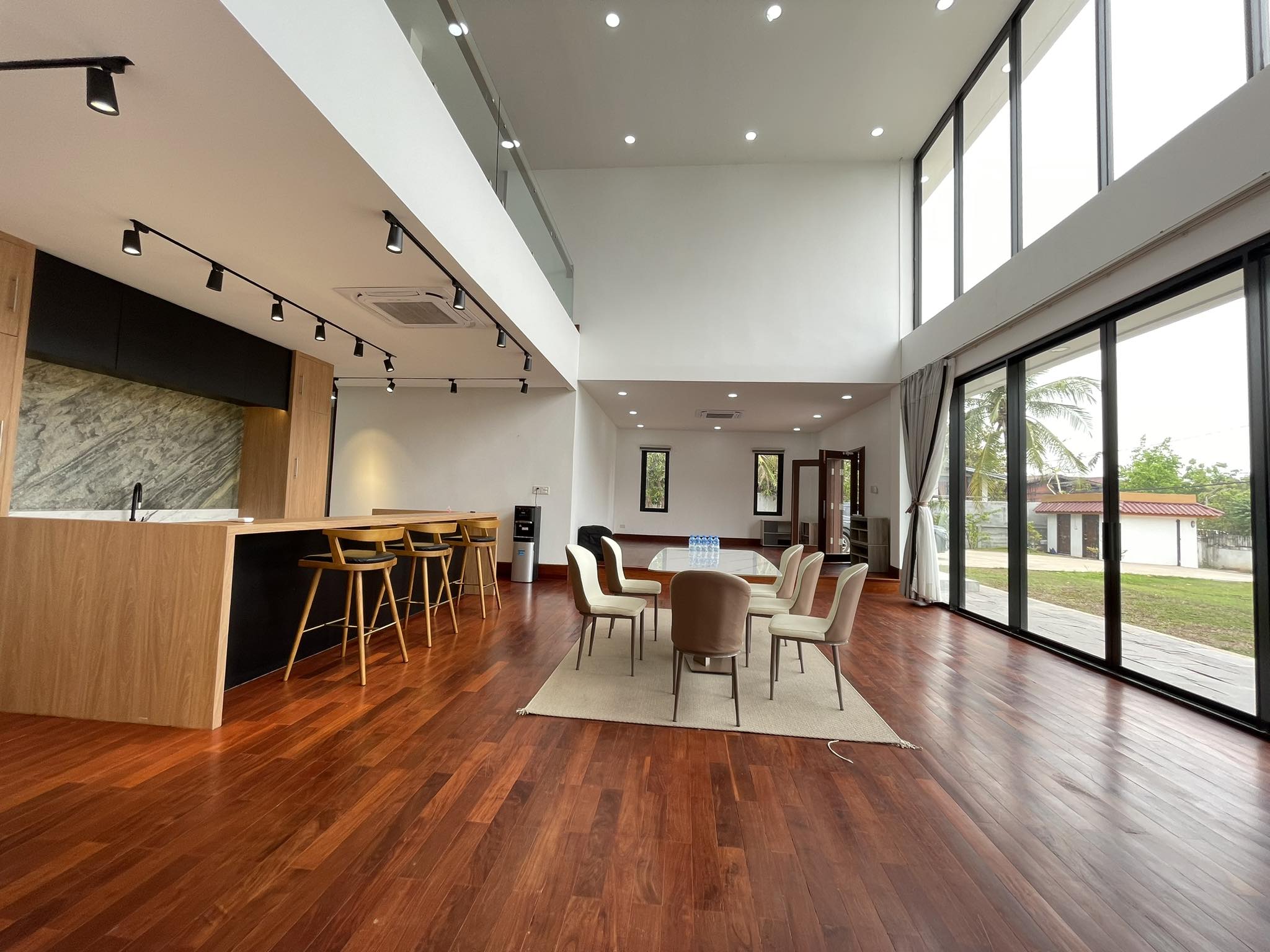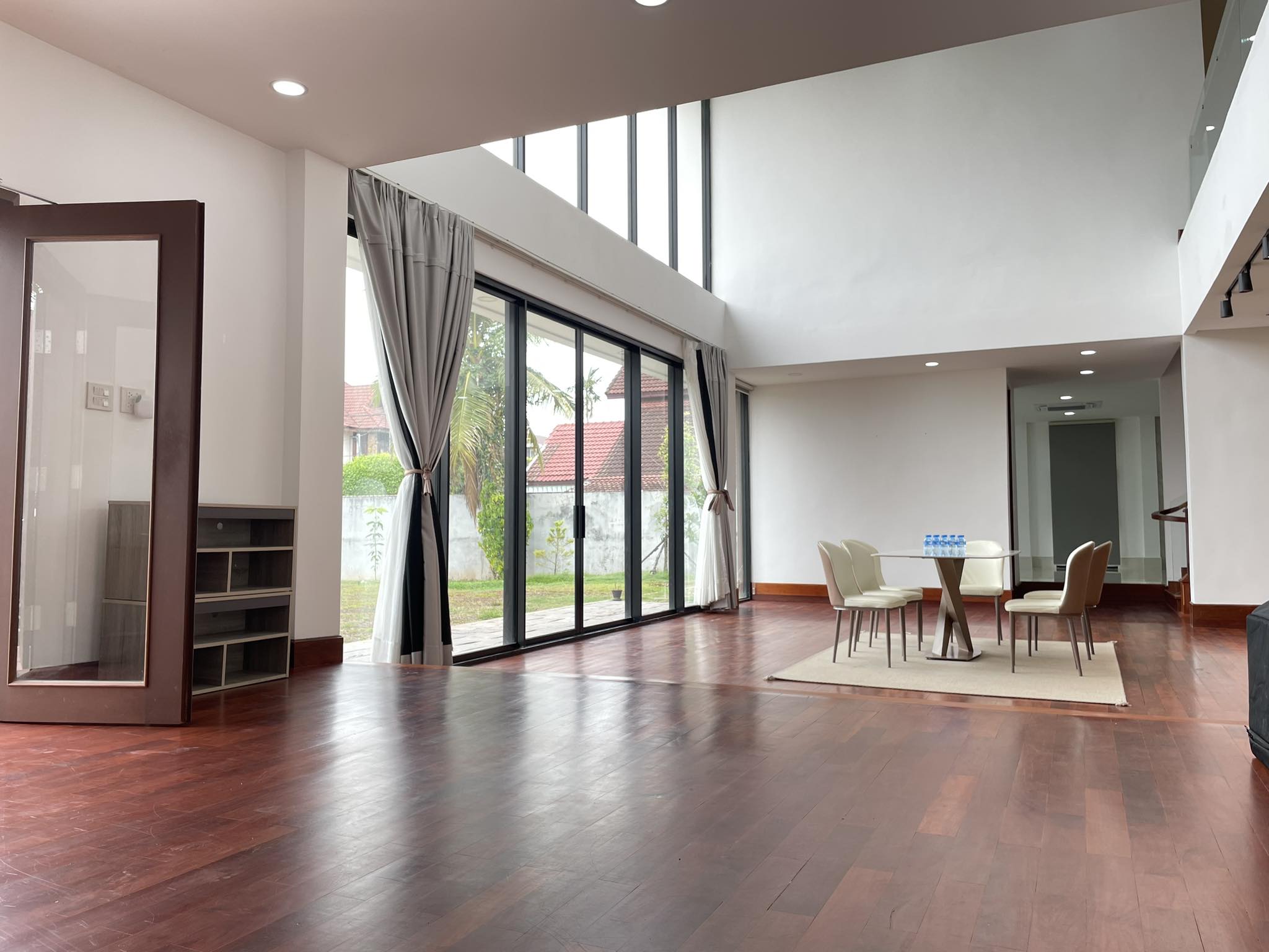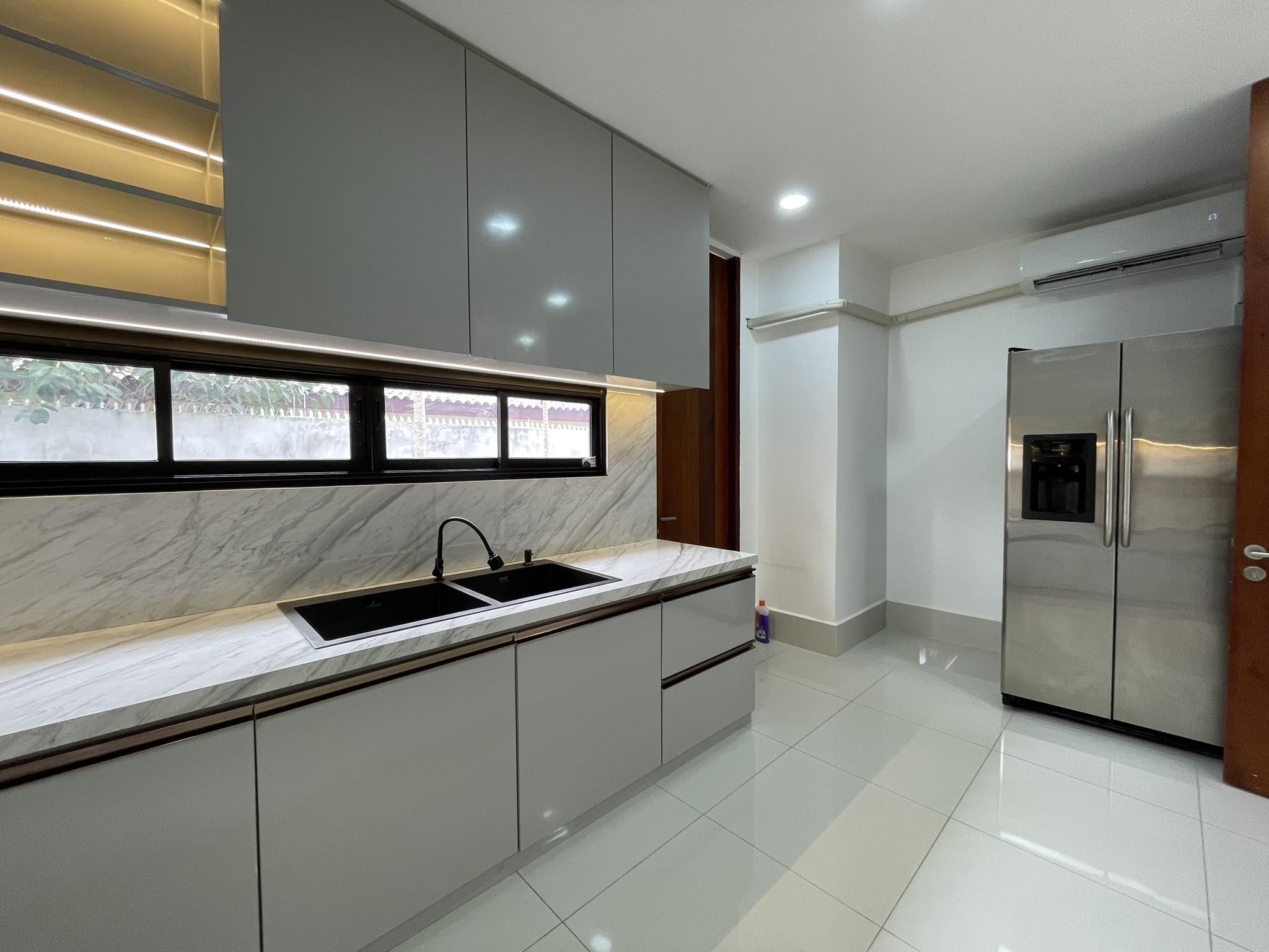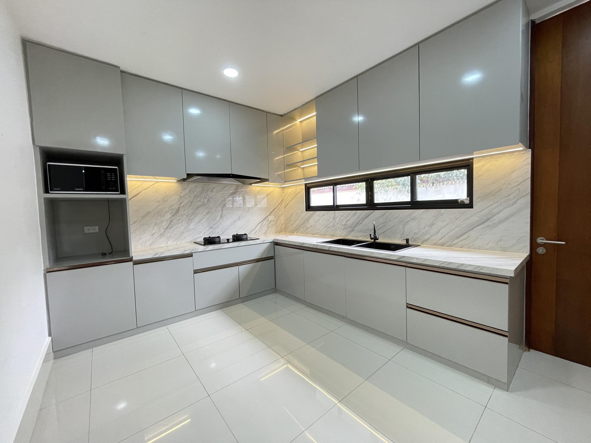 4 bedrooms, 5 bathrooms, 1 large living room, 1 living room, 1 family room in the second floor, TV room, counter bar in the dining room, 1 kitchen, 1 washing room, electric cooker, cooker hood, electric oven, hot water system, shower, high ceiling, hot water system, jacuzzi bathtub/ shower, big glass windows, tile floor, electric appliance, cars parking spacious, nice yard, fence, gate.